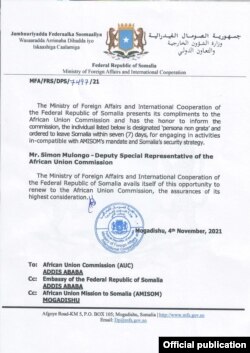 Wasaaradda Arrimaha Dibadda Soomaaliya ayaa qoraal ay u dirtay Guddiga Midowga Afrika waxay Simon Mulongo, oo u dhashay dalka Uganda, ku eedeysay “dhaq-dhaqaaqyo aan la jaanqaadi karin waajibaadka shaqo ee AMISOM iyo istiraatiijiyadda amniga Soomaaliya.”